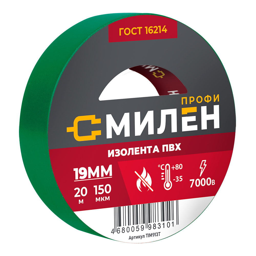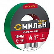 Изолента, ПВХ, 19мм * 20м, 150 мкм, 7кВ, зеленая, Милен
